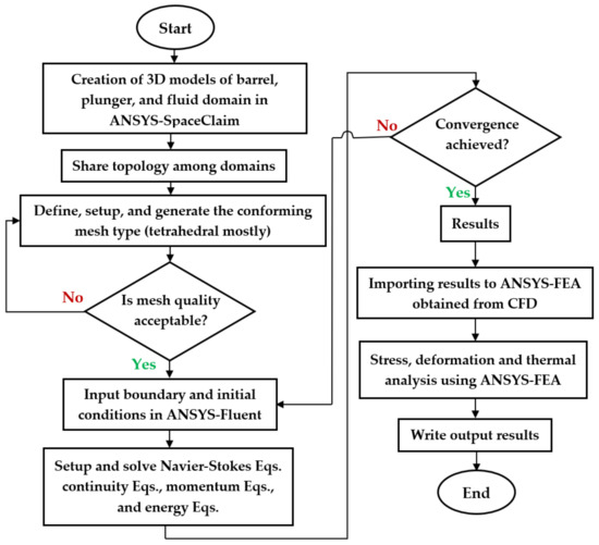 The paper employs a unidirectional fluid–solid thermal coupling calculation method to compute the pressure and temperature distributions within the fluid region. The boundary conditions for the stress field in the solid region are determined by loading the fluid pressure and temperature in the barrel/plunger interface onto the inner wall of the barrel/plunger. To simulate 3D models of the barrel, plunger, and fluid domain involved in thermal fluid–solid interaction (TFSI), Table 1 displays the 3D modeling design parameters. The physical finite element model and the boundary conditions are depicted in Figure 3a,b, respectively, based on the data given in the literature [7]. Grids defined each structure, including the plunger, barrel, and fluid domain, mostly tetrahedral. The type of mesh/grid is conforming mesh suitable for the solid and fluid domains by sharing their topology and avoiding interface problems. Table 4 lists the grid sizes and numbers for the various constructions. For network independence verification, multi-parameter and multi-node verification are used. The key points at the plunger stem are used to compare the displacement under different grid numbers. Figure 6a displays the differences in plunger/barrel displacement sections as a function of the number of grids.
