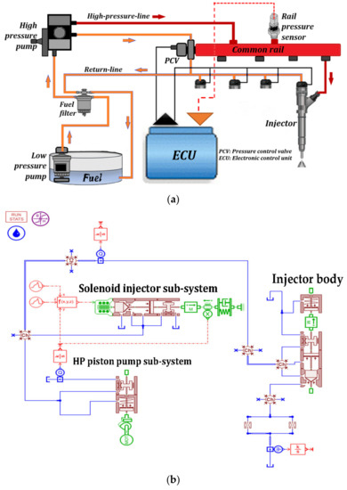 (a) High-pressure common rail system and (b) 1D modeling of fuel injection pump system in AMESim.