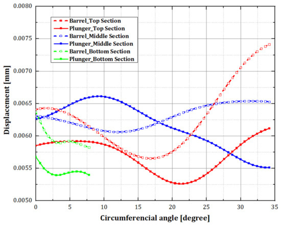 According to Figure 7, the maximum interference (overlapping region) radial displacement was 0.0008 mm. It occurred between the plunger’s middle section and the barrel’s middle section when the circumferential angle was 10 degrees.