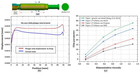 Displacement measurements: (a) measuring the displacement of the plunger in the stem, (b) comparing the displacement of the plunger stem in the simulation result of Hong [7] for validation, (c) a comparison of present modified taper geometries of the plunger stem using three kinds of fuels on film parameters against dimensionless viscosity with reference study conducted by Hong et al. [5].