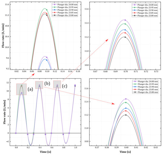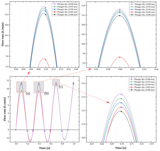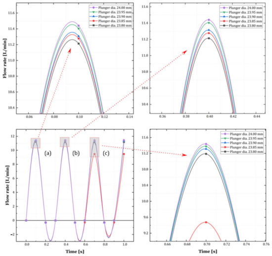 The results of configuring a high-pressure pump with one injector unit using AMESim are shown in Figure 10, Figure 11 and Figure 12. The test values obtained by comparing different plunger diameters and mean flow rates for the configured simulation in AMESim are illustrated in Figure 5b.