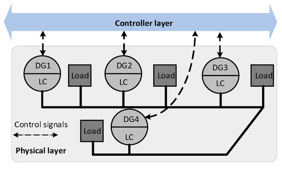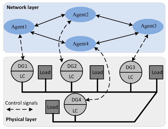 In the above control methods, both centralized control (as shown in Figure 5) and distributed control (as shown in Figure 6) schemes require information exchange [5,114]. Such information exchange is scheduled according to the specified communication cycles. For distributed control, each agent needs to update its status information to its neighboring nodes at each iteration. This also makes the use of communication networks more conservative [9]. When the control messages are passed between DGs, delays inevitably occur, both in high and low bandwidth communication networks [12,114]. In addition, interference and data packet loss during communication are also influential factors that must be considered. Especially when multi-objective control is implemented, the communication network is prone to delay, packet loss, and other phenomena, which lead to system stability weakening or even failure in some consensus.