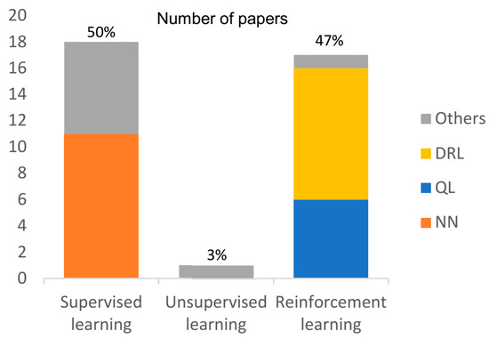 The distribution of ML algorithms utilized in microgrid hierarchical control is illustrated in Figure 7. It is observed that supervised learning and RL are the two primary approaches. Among the literature employing supervised learning, 61% utilizes neural network-based control, indicating that neural networks are currently a prominent research area. Regarding RL, 35% of studies are based on Q-learning, while 56% focus on DRL, both of which are considered mainstream research directions. Notably, recent research has shown increased attention towards combining Q-learning with DDPG or MINLP, as well as the application of DRL with DDPG. However, it is important to address the challenges related to computational requirements and communication issues associated with these approaches.