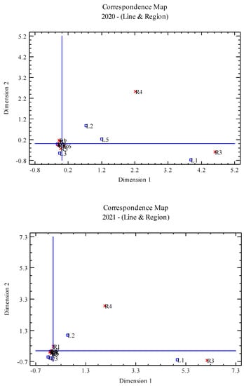 Line and region are significantly associated in the two selected periods before and during the COVID-19 pandemic.
