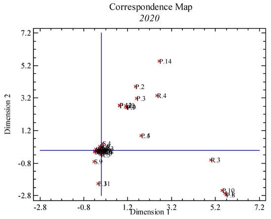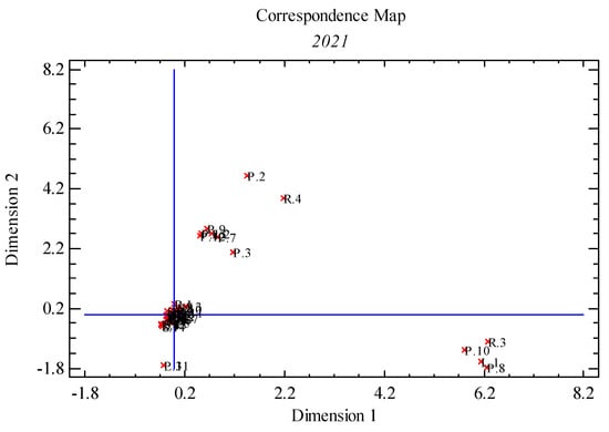 The working principle of MCA is that two or more categorical variables can be recoded in an indicator matrix as dummy variables or in a Burt matrix (B), where B = X′X, as a combination of categories by categories [43].
