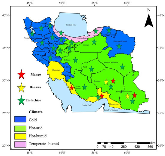 The present study used the stochastic production function of Just and Pope [26] and the fixed effects model to evaluate the impact of climate change on the yield risk to pistachio, banana, and mango in Iran. Panel data on production and yield, and climatic parameters (minimum temperature, maximum temperature, average precipitation, and precipitation deviation) for the period of 1998–2020 were collected from the Ministry of Jihad-e Agriculture and the Iran Meteorological Organization. The model was estimated using the STATA13 software package. However, the climatic diversity of Iran in different zones was a source of remarkable differences in the results for the crops in question [27]. As the present study contains hot–arid, hot–humid, temperate–humid, and cold regions, given the limitations in data availability, the climates were selected using Gangi’s [28] classification.