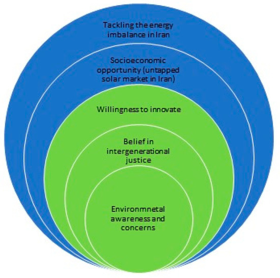 Ecological awareness and concerns, belief in intergenerational justice and willingness to innovate, as the intrinsic drivers of the supply side of solar PV market acceptance, emerged out of this research, is opposite the main stream in the world, pioneering by energy transition role-models, where the economic motives (growing demands for RE), and political supports and incentives are the key drivers [9,49,50,51,52,53]. Even before the driving role, attention to environmental issues, including environmentalism concept and modern environmental movements is originated in Western Countries and is intensively dealt with (academically) theoretical/empirically by European researchers [2,54,55,56,57]. Iranian Solar businesspeople activity in this field as a proof for their prioritised environmental and social drivers in spite of the existing barriers, does first increases the possibility of pro-environmental behaviours, and second, it can inform the policymakers of the existing social capacities paving the way for energy transition.