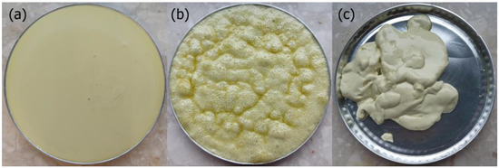 View of the oleogel and the stages to obtain it: (a) emulsion, (b) emulsion after drying, (c) oleogel after homogenization.