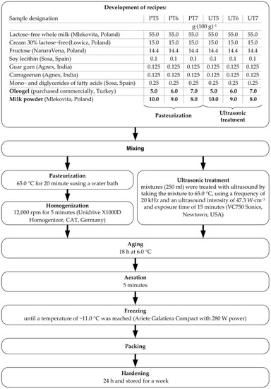 - Nazarewicz, S.; Kozłowicz, K.; Kobus, Z.; Gładyszewska, B.; Matwijczuk, A.; Ślusarczyk, L.; Skrzypek, T.; Sujka, M.; Kozłowicz, N. The Use of Ultrasound in Shaping the Properties of Ice Cream with Oleogel Based on Oil Extracted from Tomato Seeds. Appl. Sci. 2022, 12, 9165. [Google Scholar] [CrossRef]