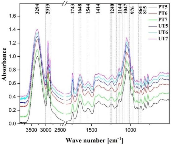 The positions of the absorption band maxima in the FTIR spectra were determined, and the corresponding vibrations were assigned for the selected samples: PT5, PT6, and PT7 and UT5, UT6, and UT7 [69,71,75].