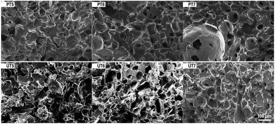 Scanning electron microscopy was used to examine the structure of the ice cream (pasteurized ice cream: PT5—sample with 5% strawberry-seed oleogel, PT6—sample with 6% strawberry-seed oleogel, PT7—sample with 7% strawberry-seed oleogel; ultrasound-treated ice cream: UT5—sample with 5% strawberry-seed oleogel, UT6—sample with 6% strawberry-seed oleogel, UT7—sample with 7% strawberry-seed oleogel).
