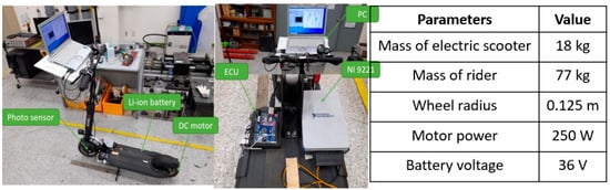 Figure 1 presents the components of the ES experimental setup. In order to collect and store experimental data, a LabVIEW program was installed on a local PC []. The ES energy was supplied through a Li-ion battery 36 V, 9 Ah to the dc motor and, in order to measure the ES’s velocity and travel distance, an electric control unit (ECU) was installed on the ES frame, which read the signals from a photosensor. The ECU was connected to the PC to store the data when the experiment was conducted. The analog signals of the battery voltage were measured by an NI 9221 with a 60 V input channel at 800 kS/s, which was connected to the PC by the LabVIEW program, and the photosensor was utilized to measure the speed of the front wheel. A dc motor located at the rear wheel helped the ES to overcome friction, wind, and grade resistance force by creating propulsion force. The condition of the experimental test was instituted by the following: the electric scooter weight of MES = 18 kg, a rider weight of MD = 77 kg, and a wheel radius of RW = 0.125 m. The 60-s experiment was conducted alongside the Taehwa River in South Korea, where the road grade was 0% and the wind speed was roughly 0 km/h.