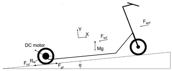 The propulsion force of the electric scooter was calculated by substituting Equation (4) into Equations (9) and (10); it was represented by the following: