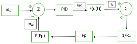 The speed-controlling algorithm of the electric scooter using the PID controller is shown in Figure 4. The PID controller used in this paper considered the voltage as a control variable, which was adjusted to control the total torque and the motor torque on a scooter wheel (Tpf + Tm).