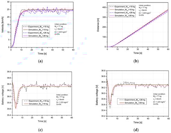 Figure 5c,d compare the experimental and simulation battery voltage when reducing the scooter weight from 26 kg to 18 kg. The electricity consumption was reduced in both the simulation and the experiment. The reduction of electric consumption is explained by reducing the load on the motor and thus the energy demand. The maximum differences are 0.38% and 0.47%, corresponding to scooter weights of 26 kg and 18 kg, respectively. In the experiment, the battery voltage value is considered an average value, therefore, it is acceptable for the maximum scale as a result. To decrease the velocity and battery voltage difference between the experimental and simulation results, aside from input corrections in view of rider mass, slope ratio, and wheel radius, sudden wind should be controlled to reduce that error.