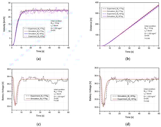 One of the parameters that is difficult to avoid during ES operation is the rider mass, which directly affects the dynamic characteristics of the ES during movement. This simulation and experiment were run to examine the impacts of driver mass on the characteristics of motion with initial conditions of 0 km/h wind speed, 0% slope grade, 0.125 m wheel radius, and 18 kg ES mass when the rider weight was raised from 77 kg to 87 kg. The results are shown in Figure 6. We can observe that the velocity and travel distance from the experiment and simulation were decreased when the rider weight was increased from 77 kg to 87 kg, as shown in Figure 6a,b. The maximum differences between the experiment and simulation of velocity were 9.59% at 24 s and 9.21% at 47 s when the weight of the rider was 77 kg and 87 kg, respectively. Figure 6c,d compares the effects of driver mass on battery voltage during the simulated and experimental ES operation. From the simulation results, the consumed electricity was decreased by 0.06% when the rider weight was changed from 87 kg to 77 kg, and the timing of battery voltage stabilization was shortened from 14.9 s to 14.4 s in the same conditions. The reason for this decline in electricity consumption was the decrease in total resistance force that led to reducing the load on the motor. The maximum differences were 0.4% at 28.5 s and 0.39% at 46.5 s with a rider weight of 87 kg and 77 kg, respectively. This maximum scale is tolerable because the battery voltage is considered another average value during the experiment. As with the velocity discrepancy described above, the battery voltage discrepancy between the experiment and the simulation was caused by a sudden wind in the actual road test. The velocity error between the simulation and experiment was caused by a sudden appearance of wind during the experiment.