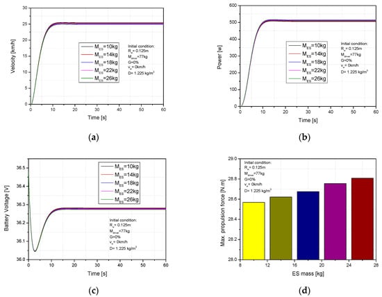 Impact of the ES mass on (a) velocity, (b) required power, (c) battery voltage, (d) propulsion torque.