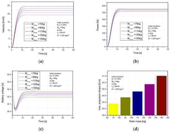 Impact of the driver mass on (a) ES velocity, (b) require power, (c) battery voltage, (d) propulsion torque.