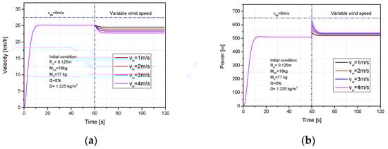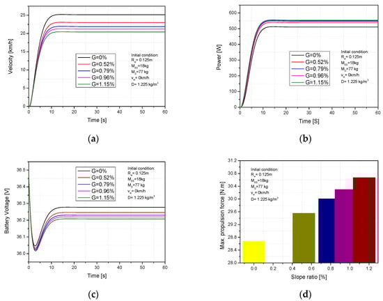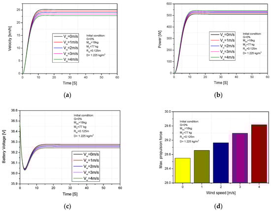 Weather conditions are difficult to avoid when using an ES. Therefore, wind needs to be fully considered to see how it affects the performance and consumed electric energy of the electric scooter. The impacts of wind speed on velocity, required power, electric consumption and propulsion torque are presented in Figure 10a,d. The wind velocity was raised from 0 m/s to 4 m/s while the other conditions consisted of rider mass, electric scooter mass, wheel radius, and slope grade of 77 kg, 18 kg, 0.125 m, and 0%, respectively. The velocity significantly dropped from 25.03 km/h to 23.05 km/h (8.5%) when the wind velocity was adjusted from 0 m/s to 4 m/s, which can be noted in Figure 10a. In addition, the times to reach stable behavior were 13.4 s and 14.2 s, respectively. Figure 10b presents the required power with rising wind speed. We can observe that the required power significantly rose from 510 w to 540.5 w (5.9%) with the rising of wind speed. The ES’s electric consumption rose 0.2% and the timing to the battery voltage stabilization extended from 12.7 s and 13.5 s when the velocity of wind was adjusted from 0 m/s to 4 m/s. In addition, the propulsion torque rose from 28.7 N.m to 29.6 N.m in the same conditions, as shown in Figure 10c,d. The increase in wind speed caused an increase of wind resistance while the other conditions were kept constant. It caused an increase in load on the motor and energy demand. As a result, the required power and electric consumption increased.