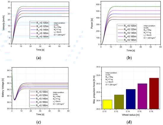 One of the structural parameters that has an important impact on the motion of an ES is the radius of the wheel, as it is directly related to the rotational inertia of an ES during operation. The wheel radius was increased from 0.105 m to 0.185 m while the other parameters were kept constant (MR = 77 kg, MES = 18 kg, G = 0%, vw = 0 km/h). Figure 11a shows that the velocity of the electric scooter significantly increased from 22.7 km/h to 31 km/h (36.5%) when the radius of the wheel was adjusted from 0.105 m to 0.185 m. with that change, the required power of the electric scooter increased from 373 w to 569 w (34.4%), as shown in Figure 11b. In addition, the increase of electric consumption was found to be roughly 0.2% by battery voltage reduction when the wheel radius was adjusted from 0.105 m to 0.185 m. Furthermore, the propulsion force increased from 28.4 N.m to 29.4 N.m in the same conditions, as shown in Figure 11c,d. The increase of wheel radius caused an increase in the load on the motor, so higher energy was required to obtain a certain velocity. This is why the required power and electric consumption increased. From the achieved results, the electric scooter reached an effective performance area with wheel radius Rw = 0.185 m. The wheel radius (Rw = 0.185 m) was chosen as a prospective input parameter for the next examination.