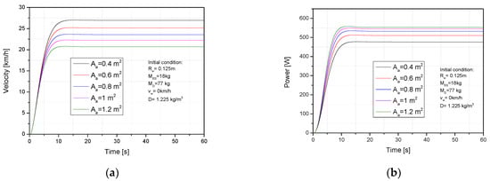 The frontal area is an important factorthat has a sensitive effect on the dynamics and battery voltage of electric scooters. The frontal area was changed from 0.4 to 1.2 m2 while the other parameters were kept constant (MR = 77 kg, MES- = 18 kg, Rw = 0.125 m, G = 0%, vw = 0 km/h). The velocity significantly decreased from 26.9 to 20.6 km/h when the frontal area was increased from 0.4 to 1.2 m2 the required power increased from 476 to 553 W in the same conditions, as shown in Figure 12a,b. This can be explained by the frontal area increase leading to an increase in wind resistance; therefore, the total resistance force rose. Figure 12c shows that the battery voltage decreased from 36.3 to 36.21 V (0.26%). Furthermore, the propulsion force increased from 28.4 to 28.88 N.m in the same conditions, as shown in Figure 12d. The total force resistance force increasing led to an an increased energy demand to supply to the dc motor. This is why the electric consumption and propulsion torque increased when the frontal area increased.