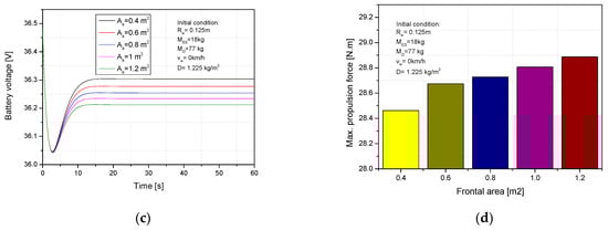 Impact of the frontal area on (a) ES velocity, (b) required power, (c) battery voltage, (d) propulsion torque.