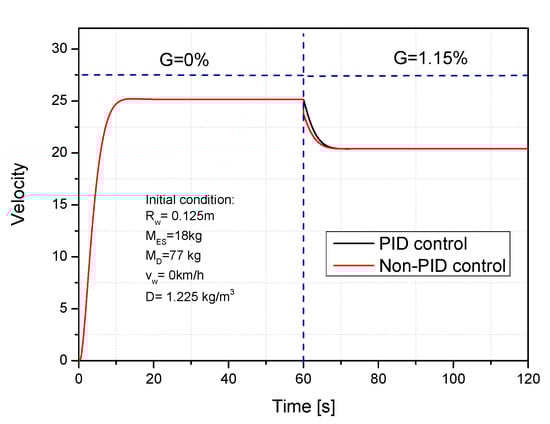 To approach the flexible behavior of electric scooter during operation, a model control study using a PID controller under the effects of wind speed and slope grade were implemented. Figure 13 presents the comparison of scooter speed under PID and non-PID control with an increase in slope grade of 1.15%. The results show that the scooter speed suddenly decreases and slowly approaches a steady speed with non-PID control. With PID control, the temporary velocity decrement has reduced after the slope grade is activated; after the decrement period, the scooter velocity quickly reaches a steady speed, as the result of propulsion torque control based on the adjusted activity voltage signal.