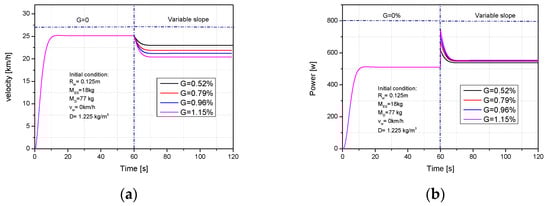 Figure 14 shows the effect of increasing slope grade to speed control under using a PID controller. The total time is 120 s. In the first stage, the slope grade was maintained at 0% within an initial 60 s. The slope grade was varied to 0.52%, 0.79%, 0.96% and 1.15% in the second stage. Figure 14a shows that the scooter velocity quickly achieved a stable value during the first stage of 60 s, when the slope grade was increased; the scooter velocity slowly decreased and rapidly reached a steady value in the second stage. Because the slope grade suddenly increased while the scooter velocity was relatively high, the real velocity was slow for a certain duration and the higher resistance when the slope grade increased was the cause of decreasing scooter velocity in the second stage. Figure 14b presents the required power with increasing slope grade while using PID control. The required power rapidly increased and reached a maximum value when the slope grade was increased, but it quickly dropped and obtained a certain value because of the controlled scooter speed. This can be explained by the higher slope grade being a cause for higher power to overcome the increasing resistance force.
