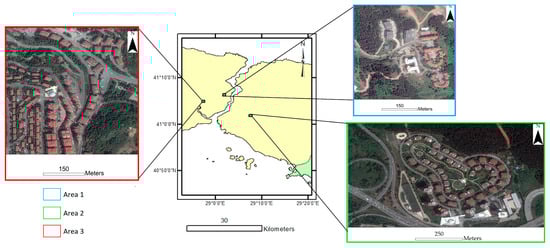 For the study area, three different locations with dense settlements were selected from Istanbul in Türkiye (Figure 2). The selected regions include many different kinds of building structures. One of the selected regions is the Istanbul Technical University campus. Other areas were selected from the same city, one from Asia and one from the European continent. An experiment was conducted in the three selected areas for building extraction with OBIA. Additionally, the buildings in the regions were also included in the test data for building floor estimation.