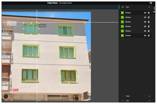Using the ‘view street’ option of the Google Maps application, screenshots of randomly selected buildings in randomly selected urban cities and streets throughout Türkiye were obtained (Figure 4). We modified and enlarged a dataset prepared by Sezen et al. [10]. The street-view images were collected with the help of operator interpretation. There are 1006 building photos in the dataset, including detached houses, apartments, and residences. The doors and windows on the building façades were manually tagged after the photos were collected. The VGG JSON and COCO JSON formats were used to export the labels. The dataset is divided into 800 images for training, 100 images for validation, and 106 images for test data. Additionally, the images of the 39 buildings in the study areas were automatically obtained via the Google Street View API using the coordinates determined from the vector data and these buildings were added to our dataset to make extra analysis.