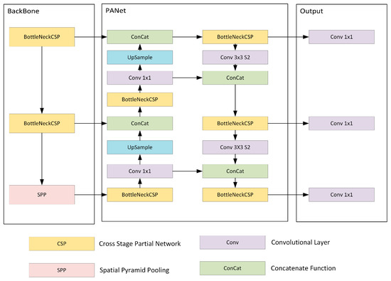 The BottleneckCSP module extracts information from the image to create a feature map [59]. Unlike other large-scale convolutional neural networks, the BottleneckCSP structure reduces repetitive gradient information in the optimization of convolutional neural networks [49,59]. Depending on the width and depth of the BottleneckCSP module, different versions of YOLOv5 are created: YOLOv5s, YOLOv5m, YOLOv5l, and YOLOv5x [42,59]. YOLOv5 also includes a PANet as a neck using a new feature pyramid network FPN structure [49] with strong top-bottom semantic features and solid bottom-up positioning features [59]. Thus, this allows the model to process and detect targets at different scales [49] in the head elements. This architecture is illustrated in (Figure 5) as represented in Xu et al. [60].