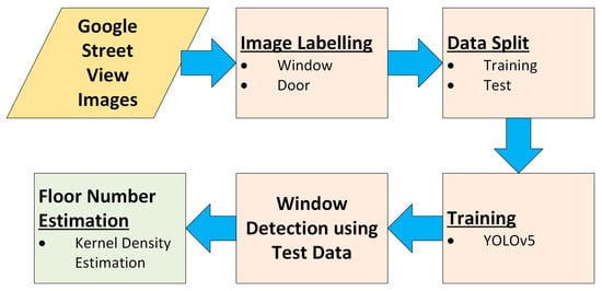 The second goal of our study is to document the vertical elements of building façades and automatically detect the number of building floors. Windows and doors are the main elements of buildings used to identify the building floors. We modified and enlarged a dataset prepared by Sezen et al. [10]. This dataset contained approximately 1000 Google Street-view images of the buildings in different streets of Istanbul and structures in ITU Ayazağa Campus. The YOLOv5 algorithm was used for window and door extraction. Then, the midpoints of the windows were calculated. The calculated midpoint coordinates were grouped along the y-axis of the image using the kernel density estimation method. It was accepted that the number of groups formed corresponds to the number of floors in the building. The general workflow of the methodology used in this study is shown in Figure 1.