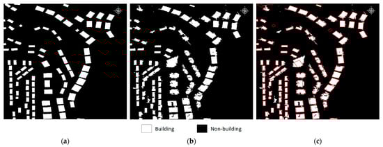 Segmentation results of the OBIA in Area 3. (a) Ground truth; (b) classification result with OBIA; (c) comparison with ground truth.