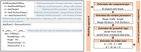 In the context of structural design for rural buildings, the geometry of the components plays a crucial role as a design parameter that requires iterative testing and optimization to achieve the most reasonable design results. BIMBase is based on the Python language and its own pyp3d database for parametric modeling. Compared with Revit, which uses “family” as the graphic element for “class”, modeling in a programming language is more flexible and allows for the more accurate and efficient modeling of more complex geometric components, as well as the accurate expression and transmission of model information. Using the model operation commands provided in the pyp3d database, the parametric component code is written in the Python programming language to generate corresponding parametric components in the BIMBase platform. For a given type of component, the variable parameters should first be determined; afterward, the equation of the geometric logic is determined using the model basic body and the model basic command functions with the variable parameters as variables; finally, the initial values of each variable parameter are set to generate the parametric component in the BIMBase platform. It should be noted that although the various parameters of the component are variable, they still adhere to standard components, and the fixed modulus required by the state standard still must be met. Taking a parametric H-beam component as an example, the process of parametric component modeling is shown in Figure 1.