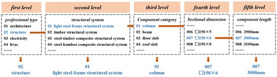 The integrated management of structural components through the establishment of a BIM component library can greatly improve the efficiency of BIM applications. The key to integrated management is the coding method of the components. Once the component modeling is completed, component coding is added based on a standardized classification, following a unified standard. This process results in the formation of component information coding in a specific format. Combined with the characteristics of rural buildings, the components in the component library are encoded at five levels with a total length of 12 digits: