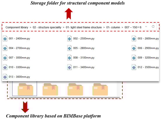 After determining the coding rules of the components, the components can be stored as model folders in sequence according to the coding sequence and saved in the component library folder. With a reasonable folder level and coding index, the location path of the corresponding component model file can be quickly and conveniently found. After the compilation of structural components of rural buildings is completed, it is packaged and imported into the component library management platform of BIMBase 2023R1.3, facilitating the creation of a parametric library for rural building structural components (Figure 3). Relying on the versatility of the BIMBase platform, the components can be imported for modeling through a user-friendly visual interface, or their model information can be directly accessed from the component library using Python code. This integrated component management greatly improves the efficiency of modeling rural building structural models while providing a solid foundation for subsequent structural design and optimization, which is the fundamental work of the framework proposed in this paper.
