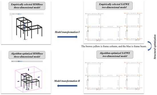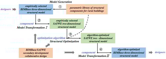 The structure of the proposed framework with BIM and optimization algorithm for the structural design of the rural buildings is explained in this section. As shown in Figure 4, four modules are consisted in the proposed framework: (1) Model generation, (2) Model transformation I, (3) Structural optimization, (4) and Model transformation II, which will be discussed in the following sections.