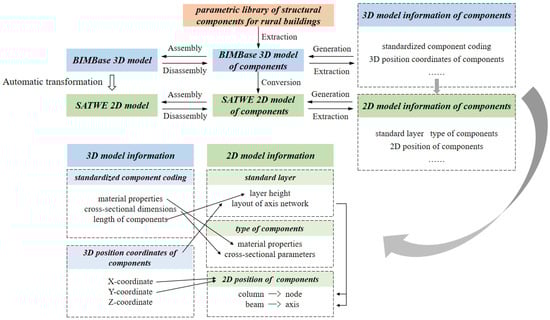 In the BIMBase three-dimensional structural model, two types of three-dimensional model information can be extracted from any component. The first type of three-dimensional information is standardized component coding. Through this coding, the key information, such as the cross-sectional parameters, material properties and length of the component, can be searched from the component library. The second type of three-dimensional model information is the three-dimensional position coordinates of the component in the BIMBase three-dimensional model, which determines the position of the component in the overall model. When generating components in the SATWE two-dimensional model, it is crucial to first determine the appropriate standard layer and axis network where the components will be situated. Subsequently, the components are positioned on the corresponding nodes or axes based on their type (section information) and two-dimensional position within the standard layer. In order to realize this component generation process, it is necessary to transform the three-dimensional model information extracted from the BIMBase model into the two-dimensional model information required by the SATWE model, as shown in Figure 6. The process of extracting and transforming model information through component-based methods avoids the loss of data and errors in data conversion. This enables smooth collaboration among different software systems during the design process. Furthermore, additional structural behavior and physical information extracted from BIMBase three-dimensional models are packaged into a compatible data format for structural analysis. Based on the above-mentioned model transformation method, in conjunction with the API interface of the BIMBase platform, a program for the mutual transformation of BIMBase and SATWE is developed to realize the collaborative design of the two pieces of software.