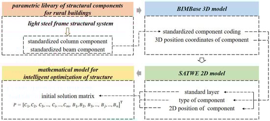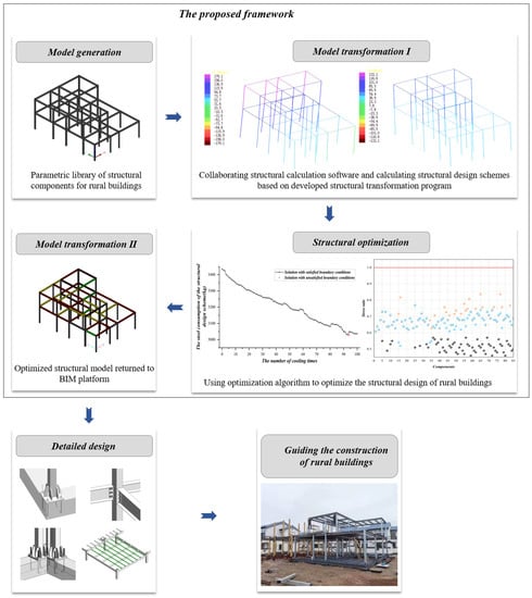 Therefore, the objective of this research is to develop a new framework that combines BIM and optimization algorithms for light steel frame structures in Chinese rural areas. According to the state standard [15,16], a set of standardized components suitable for rural buildings is established, which can be directly used for model assembly on the BIM platform. The standardized component coding and index are studied to facilitate the retrieval of components in the component library for rapid BIM modeling. The interaction between BIM and other structural analysis software is realized through the secondary development of BIM, with the component of the library serving as the basic unit. The improved two-stage simulated annealing algorithm is applied to the structural design and optimization of rural buildings to achieve greater material savings and economical design solutions. Illustrative examples of two prefabricated rural light steel frame structures show the effectiveness and efficiency of the proposed framework in providing structural design and optimization solutions. Through the framework proposed in this paper, a simple, economical and efficient automatic design method can be provided for rural buildings.