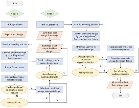 A number of variations and enhancements of the annealing algorithm have been proposed in the literature to improve its search performance. The two-stage SA algorithm employed in the present study is based on the improvement of the technique as formulated by Tort et al. [40]. The generated flow chart of the initial solution is shown in Figure 7. In the first stage of this method, only the size of the frame columns in the primary structural scheme obtained from the engineer‘s experience is optimized by the annealing algorithm, while the frame beams are sized with a fully stressed design based on the heuristic approach. The initial design is rapidly improved in a relatively small number of iterations. In the second stage, the previously obtained optimal design is utilized as the initial solution, and under a set of new annealing parameters, the structural component size variables are iteratively optimized until the structural design scheme, satisfying both safety and economy, is obtained. The main process of the algorithm (Figure 8) is as follows.