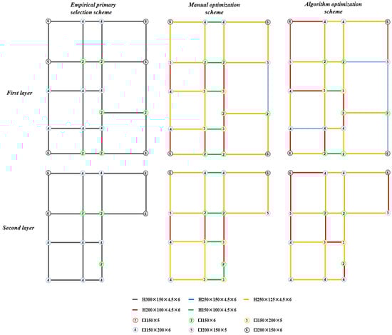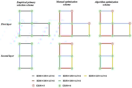 The second example is a two-story light steel frame with 35 column components and 50 beam components. The three-dimensional model of the structure is shown in Figure 12. Again, this building was designed using both the SA and two-stage SA algorithms by performing three independent runs each. The results are reproduced in Table 4 and Table 5 in terms of the optimized weight of the design scheme and the computation time in each run of the SA and two-stage SA algorithms, respectively. For this example, the two-stage SA algorithm shows slightly better performance than the SA algorithm on average, with a significant reduction in computation time. The comparison of structural design layout schemes of example II is shown in Figure 13. The comparison of the key design indexes of example II is presented in Table 6. After example II is intelligently optimized by the proposed framework, the steel consumption of the algorithm optimization scheme is significantly reduced by 11.67% compared with the empirical primary scheme. Compared with the design scheme given by manual optimization, the difference between the two results is 2.75%. The stress ratio of the structural components of example II is presented in Figure 14. It can be concluded from the comparison results of the three schemes that for example II, the proposed framework can better optimize the structure of the empirical primary scheme. After the cooling calculation, the steel consumption is significantly reduced, and the given structural design scheme can meet the design requirements of the ultimate state of bearing capacity and the ultimate state of normal use. Compared with the results of the manual optimization scheme, the key design indexes of the algorithm optimization scheme are close to the manual optimization scheme.