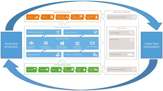 A rural–urban food systems framework with food system activities, and socio-economic and environmental drivers, bounded in governance and aiming towards outcomes of food security, sustainability and resilience, safe and healthy diets and inclusiveness and equitable benefits.