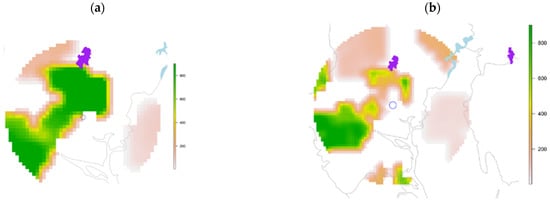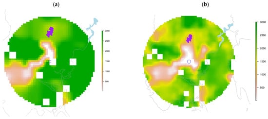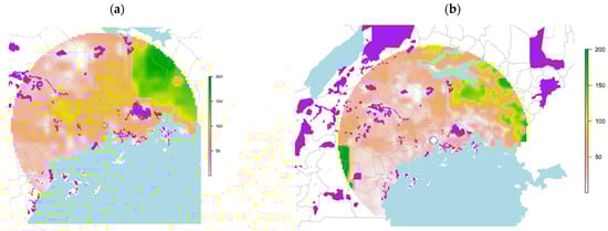 Maize: Maps of Nairobi showing the difference in area needed (km2) to produce maize locally to supply the demands projected for 2020 (a) and 2050 (b). Purple refers to protected natinal parks. (a) Area needed (11,310 km2) to produce maize demands in Nairobi in 2020 (r = 60 km) (ton per grid-cell). (b) Area needed (21,124 km2) to produce maize demands in Nairobi in 2050 (r = 82 km) (ton per grid-cell).