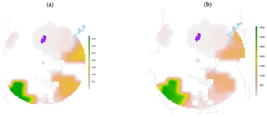 Milk products: Maps of Nairobi showing the difference in area needed (km2) to produce milk products locally to supply the demands projected for 2020 (a) and 2050 (b). Purple refers to protected natinal parks. (a) Area needed (59,396 km2) to produce milk products demands in Nairobi in 2020 (r = 138 km) (ton per grid-cell). (b) Area needed (91,863 km2) to produce milk products demands in Nairobi in 2050 (r = 171 km) (ton per grid-cell).