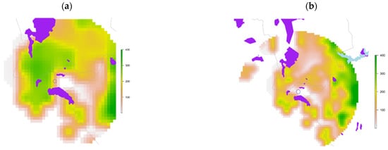 To supply the populations of Dhaka, an increase of 64% in area from 2020 to 2050 is needed to supply rice, an increase of 30% in area is needed to supply potatoes and an increase of more than double (115%) in area is needed to supply vegetables. Note that the areas are not exclusive, implying that it is possible given the assumptions of the estimates to increase the production of all three products without having implications for other crops use of area. The differences in areas needed in 2020 and 2050 are illustrated on the six maps: Figure 2a,b shows the differences in area for rice, whereas Figure 3a,b shows the differences in area for potatoes and Figure 4a,b shows the difference in area needed for vegetables.