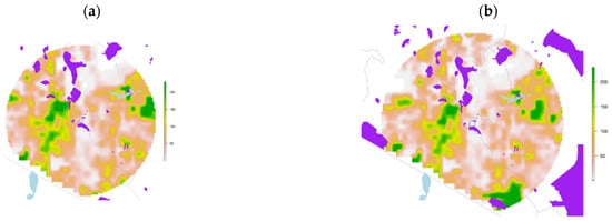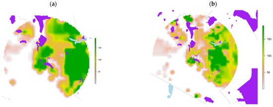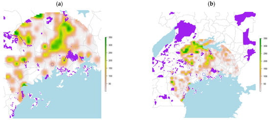 Rice: Maps of Dhaka showing the difference in area needed (km2) to produce rice locally to supply the demands projected for 2020 (a) and 2050 (b). Purple refers to protected natinal parks. (a) Area needed (14,527 km2) to produce rice demands in Dhaka in 2020 (r = 68 km) (ton per grid-cell). (b) Area needed (23,779 km2) to produce rice demands in Dhaka in 2050 (r = 87 km) (ton per grid-cell).