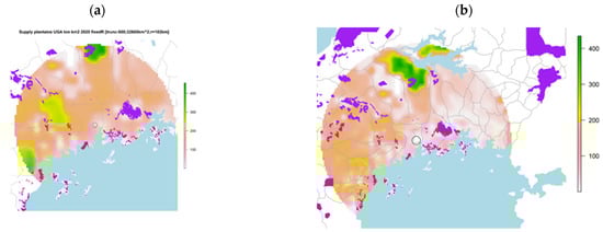 Foodshed scenario maps. In this study, the foodshed scenarios are presented on maps based on a formula, i.e., Supply (2050) = Supply (2020) × Population growth (2050), for which a projected supply in 2050 is a function of the supply in 2020 times the expected population growth. A supply map shows an amount of area needed to produce a product consumed in an urban area (a grid cell has a size of 6.25 km2 due to the resolution of 2.5 × 2.5 km, and as such the exact grid cell unit is thus ton/6.25 km2). In the two scenarios, for the years 2020 and 2050, it is assumed that all of what is consumed in an urban area is produced as close by the city as possible. Without arguing about practicalities, the scenarios assume that within a specified city border where a product is demanded, this product is produced outside the city border, within a newly defined supply border. The maps thus define an inner circle with demand, as well as an outer circle defining what area would be needed to supply what is demanded. Such a scenario of domestic supply maximization in short distance to demands is favourable as it reduces dependencies on imports, as well as reducing the overall CO2 emissions, and keeping transportation costs to a minimum. The authors are aware that in practical settings, it can be complicated to reach such optimisation given the complicated context specific factors; however, it is believed that this information can assist policy makers in increasing food availability in effective manners, particularly in highly populated cities with high degrees of urbanisation due to rural urban migration in future.