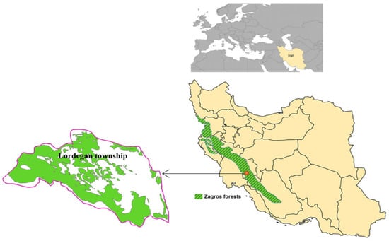 The Central Zagros region includes the entire area of the Chaharmahal and Bakhtiari province and parts of five other Zagros provinces that cover an area of 3.1 million hectares. The study area is located in the Chaharmahal and Bakhtiari province, whose forests cover 307,000 hectares, equivalent to 18.5% of the province’s area [23]. The study was conducted in the five forest villages of Hosseinabad, Hajiabad, Ahmadabad, Aliabad, and Shahrak-Mamour, which comprise Lordegan township (Figure 1). Lordegan is in the Sardasht region, which is a region where local residents have traditional or customary rights to the use of natural resources in public forests. The villages are located in a mountainous area with an average altitude of 2040 m above sea level that encompasses about 5000 ha. The main forest cover of the study area is Persian oak. The total population of the five villages is about 5824 people who belong to the Bakhtiari tribe and live in 906 forest households.