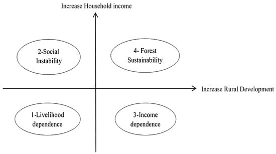 Finally, an inferential model of stimulus factors was developed that combines the rural development index with household income, enabling the determination of the position of each village in the inferential model (Figure 2). Low levels of development and low household income lead to a severe dependence of people’s livelihoods on forest resources (lower left quadrant [1]). Increased levels of household income, along with a lack of development in the area, provide context and increased motivation for migration to larger villages or surrounding cities (upper left quadrant [2]). Low levels of income combined with high levels of development in the region reduce people’s dependence on forest resources for their livelihood, but the incentive to earn more income nonetheless causes a dependence on forest resources (lower right quadrant [3]). High levels of both income and rural development reduce dependence on forest resources and promote forest sustainability (upper right quadrant [4]). The poverty line (vertical line) is used to separate the left and right quadrants in the figure.