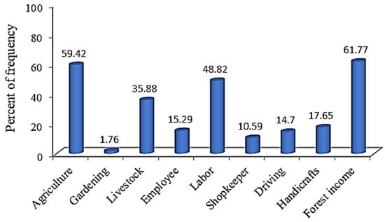 Villagers depend on nine livelihood strategies to earn a living. Income is most frequently derived from forests, agriculture, and by providing labor (Figure 3). Note that these frequencies do not add up to 100% because individual household income may be derived using several strategies. For example, while 14.7% of households earn some money from driving, for some households, this may be the main job, and for others, it may be a second or third job. The meaning of agricultural income is the income derived from cultivation activities under the forest canopy, and the meaning of gardening income is the income derived from the cultivation of fruit trees. Livestock income means the income is derived from the sale of light and heavy livestock (i.e., sheep, goats, and cows).